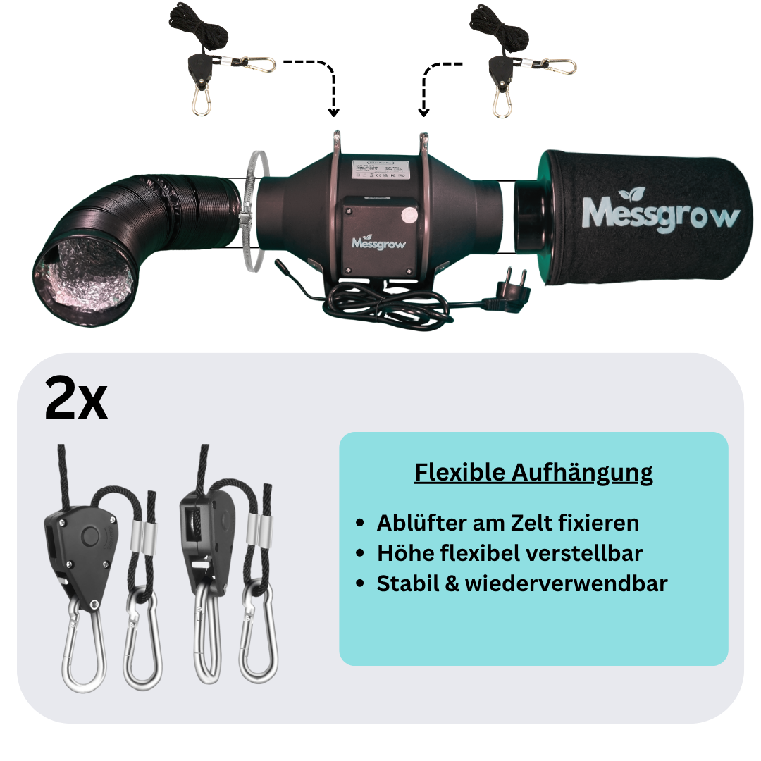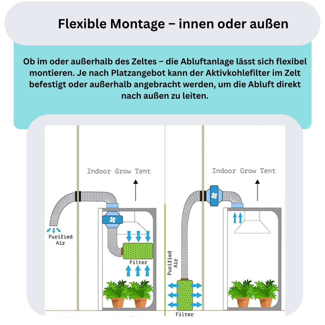 Maximale Kontrolle, minimale Geräusche – dieses hochwertige Abluft-Komplettset mit 100 mm Flanschdurchmesser ist die perfekte Lösung für effiziente Luftführung im Indoor-Grow. Ausgestattet mit einem extrem leisen EC-Lüfter, leistungsstarkem Aktivkohlefilter und smartem Mascro-Controller, steuerst du dein Raumklima präzise per App oder direkt am Gerät – für konstant frische, geruchsfreie Luft.