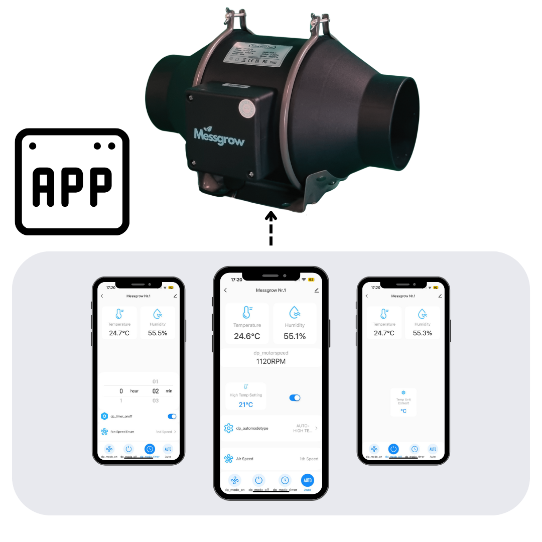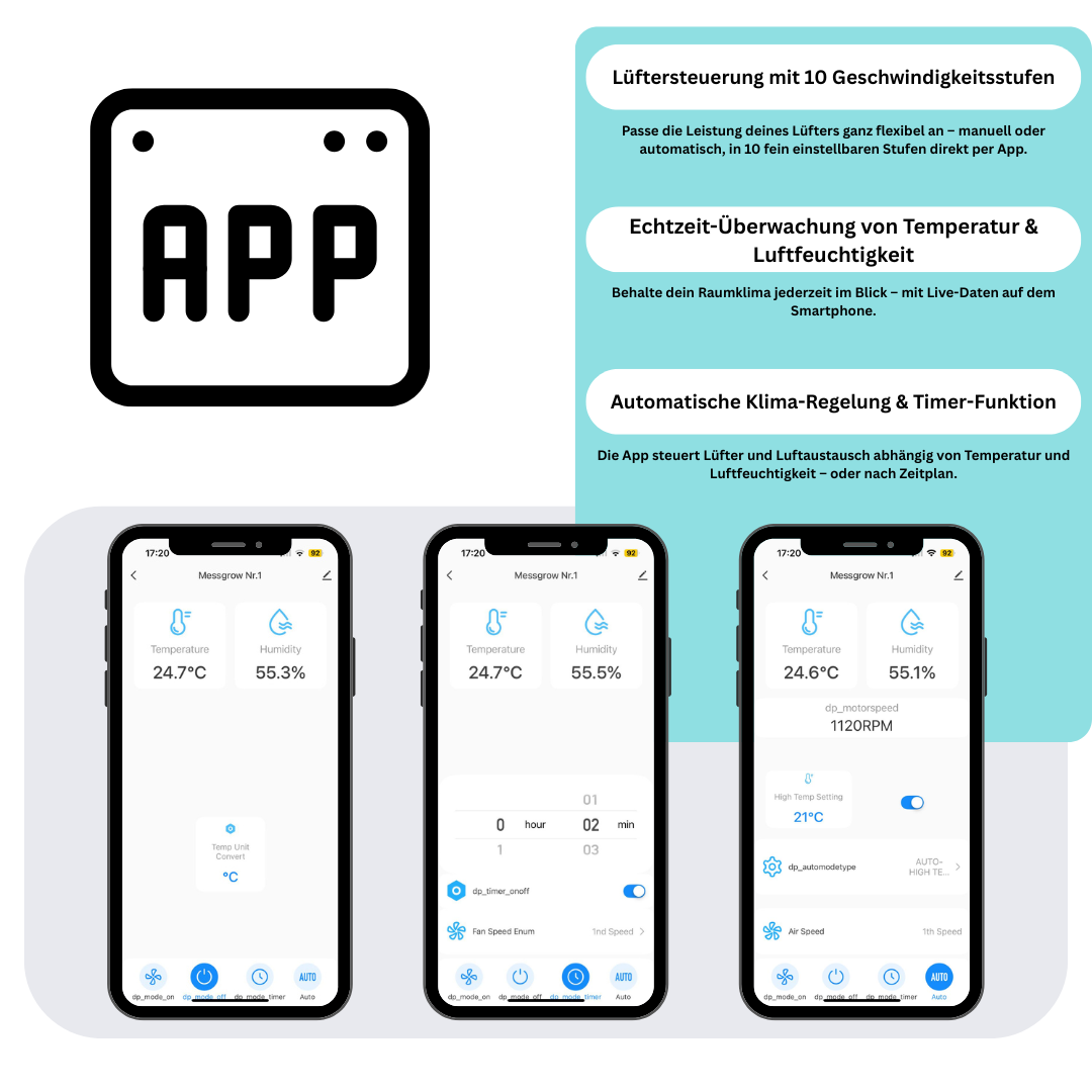 Dank 10 regelbaren Lüfterstufen, integriertem Temperatur- & Feuchtigkeitssensor sowie App- und Controller-Steuerung behältst du jede Phase deines Grows im Griff – automatisch oder manuell. Ideal für Growzelte von 80×80 bis 120×120 cm.