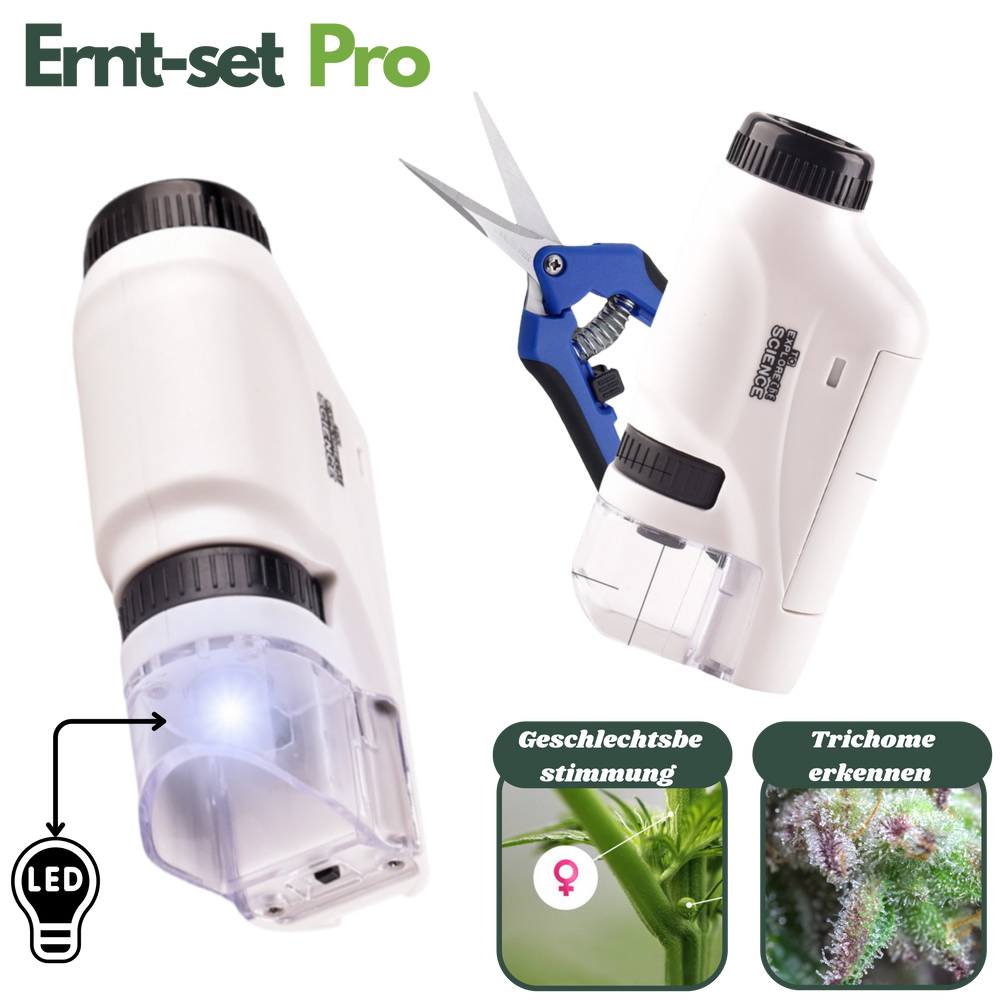 Das enthaltene Taschenmikroskop mit 60x–120x Vergrößerung ermöglicht eine klare Sicht auf feine Strukturen wie Trichome oder Anzeichen von Schimmel. Die integrierte LED-Beleuchtung sorgt auch bei schlechten Lichtverhältnissen für eine zuverlässige Kontrolle.