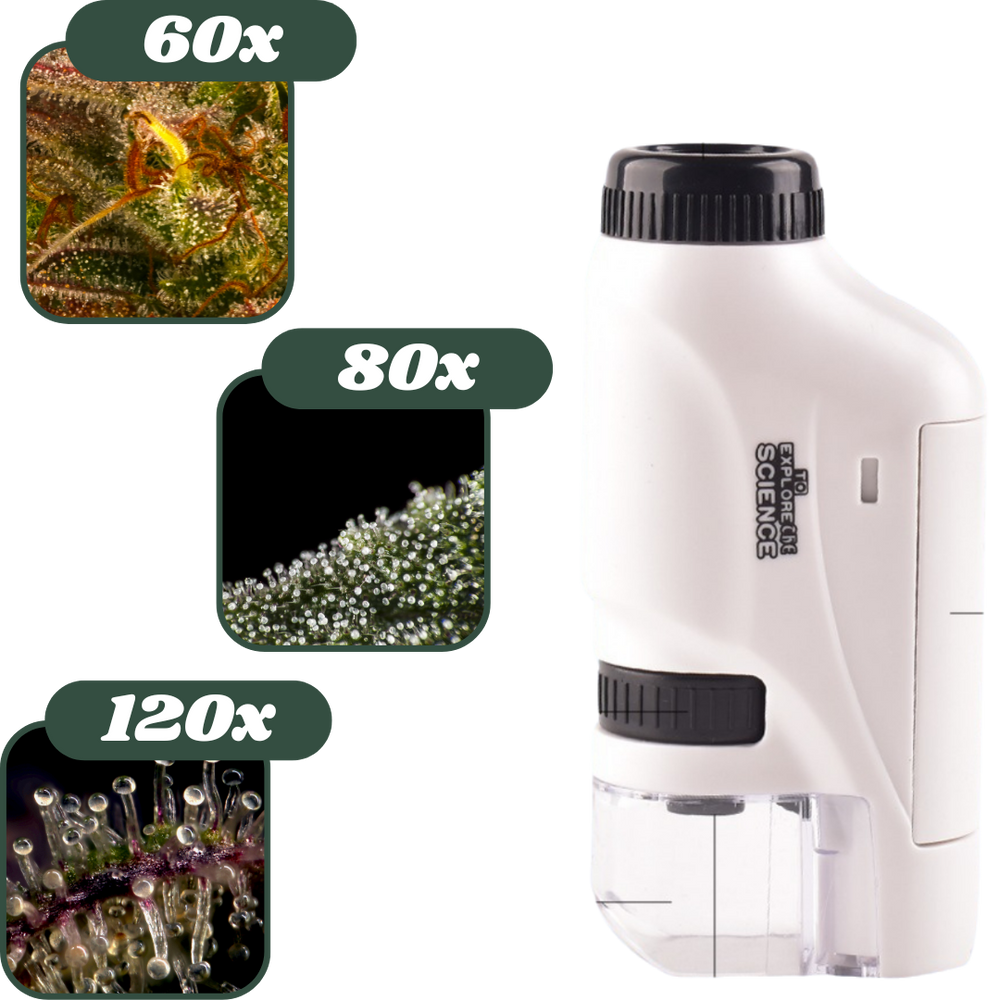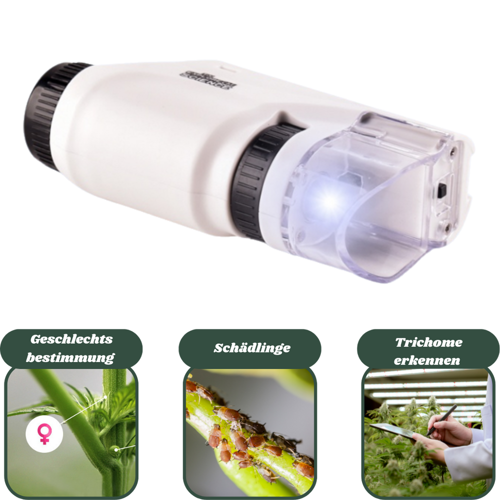 Das Grow Taschenmikroskop 60x-120x (Größe: 10,5 x 5,3 cm) ist ein unverzichtbares Tool für jeden Cannabis-Grower, der die Entwicklung seiner Pflanzen professionell überwachen möchte.