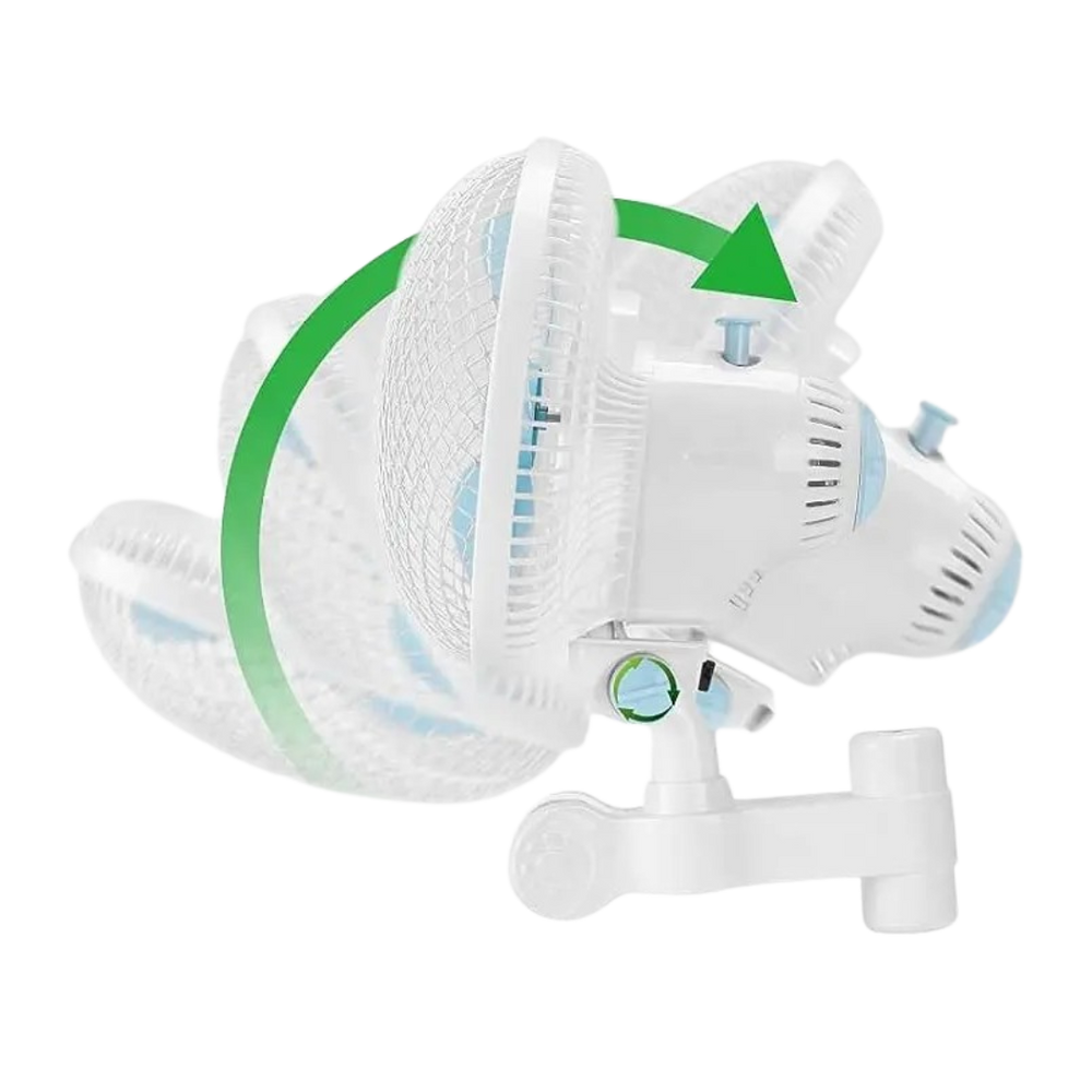 Dieser kompakte 6-Zoll-Ventilator (Ø 22 cm) sorgt für sichere Umluft im Indoor-Grow. Zwei Geschwindigkeitsstufen, eine breite Oszillation von 90° horizontal und 120° vertikal sowie ein verstellbarer Neigungswinkel ermöglichen eine gezielte Steuerung des Luftstroms – perfekt zur Vorbeugung von Hitzestaus und zur Stärkung der Pflanzenstruktur.