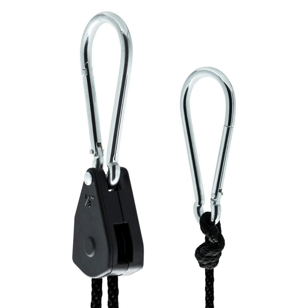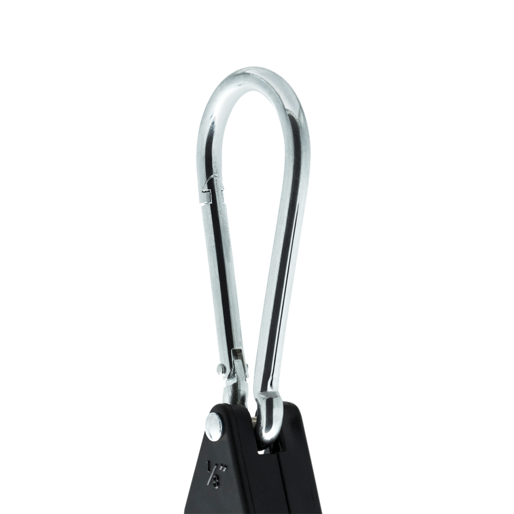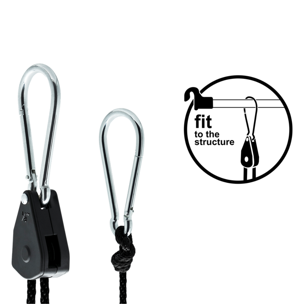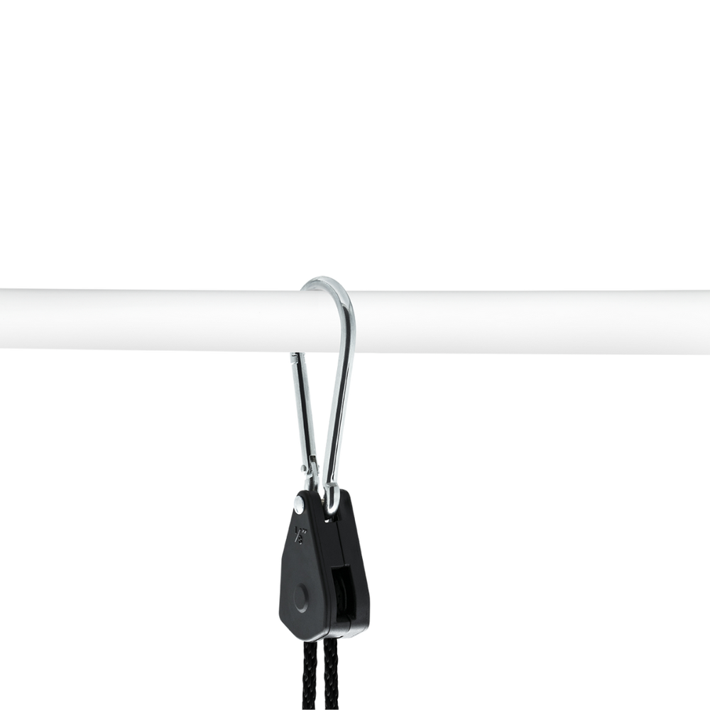 Dank der extra großen Karabinerhaken (Ø 36 mm) und der stabilen Seilzugmechanik lässt sich die Höhe deines Equipments im Handumdrehen anpassen. Ziehen zum Hochstellen, Knopfdruck zum Absenken – einfacher geht es nicht.