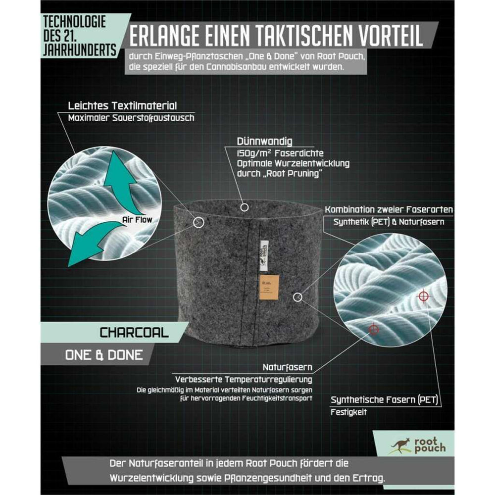 Der Root Pouch 12 L Charcoal ist ein besonders leichter, atmungsaktiver Stofftopf mit nur 150 g/m² Grammatur – speziell entwickelt für den Einsatz in Hydroponik-Systemen, größere Pflanzen oder auch professionelle Grows. Durch das perfekte Luft-Wasser-Verhältnis im Substrat wird Staunässe verhindert, die Wurzelbildung verbessert und ein vitales, fein verzweigtes Wurzelsystem gefördert.