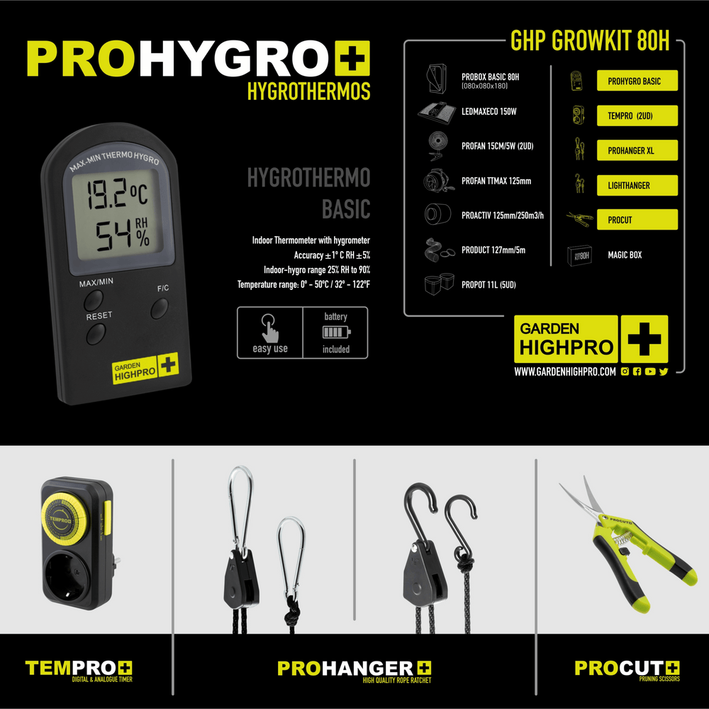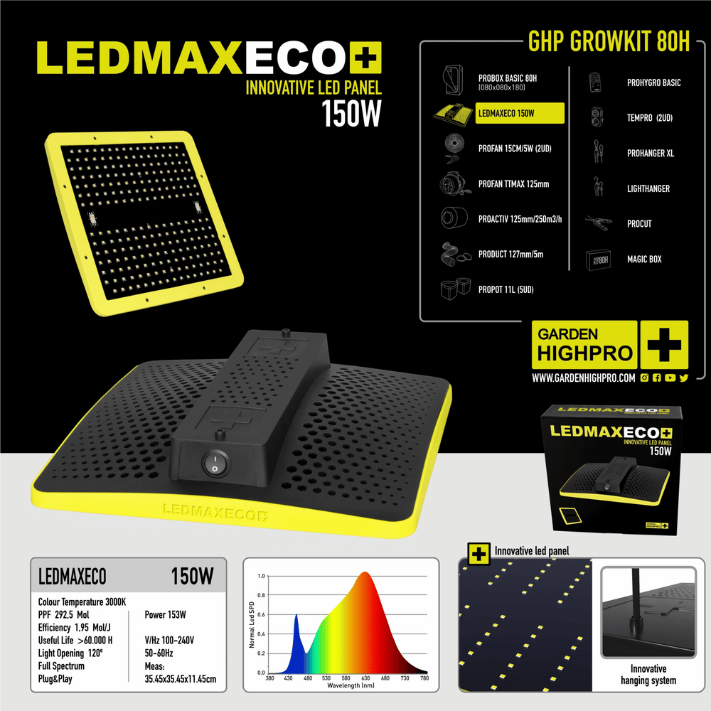 - Komplettset-Ausstattung: Growbox Basic 80H, dimmbare LEDMAXECO 150W, Lüfter mit Aktivkohlefilter, Stofftöpfe, Hygrometer, Zeitschaltuhren und Zubehör.
