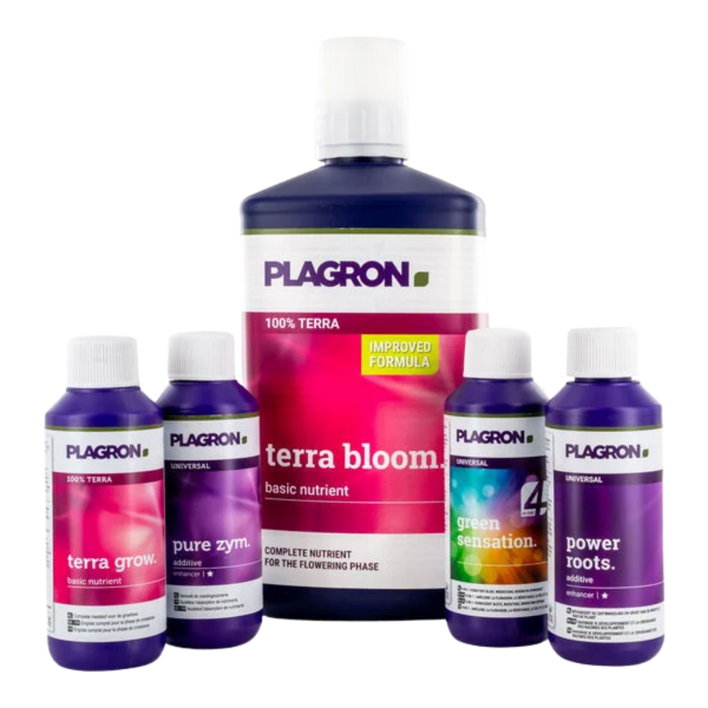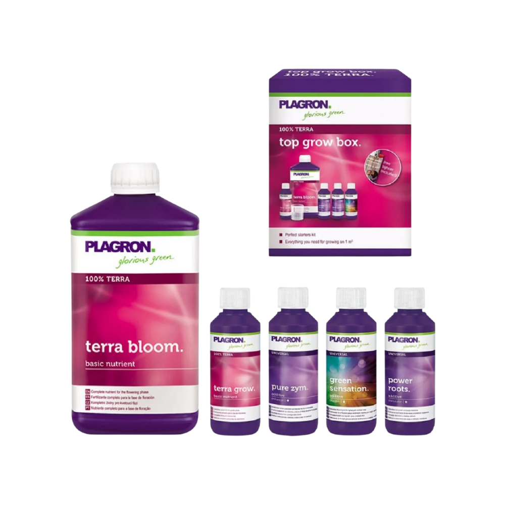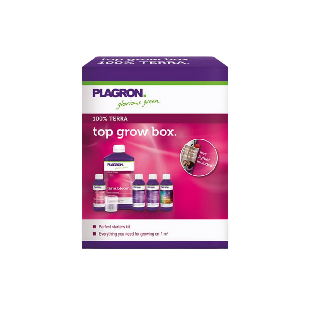 Die Plagron Top Grow Box Terra ist dein Rundum-sorglos-Paket für den erfolgreichen Pflanzenanbau auf Erde – ideal für Einsteiger und erfahrene Grower. Enthalten sind alle wichtigen Düngemittel, um deine Pflanzen durch Wachstum und Blüte zu begleiten: von Terra Grow für kräftiges Pflanzenwachstum bis Terra Bloom für eine reiche Ernte. Zusätzlich liefern Power Roots, Green Sensation und Pure Zym alles, was für gesunde Wurzeln, starke Blütenbildung und eine optimale Nährstoffaufnahme nötig ist. Das Set ist auf eine Fläche von bis zu 1 m² ausgelegt und enthält ein übersichtliches Düngeschema für eine einfache Anwendung.