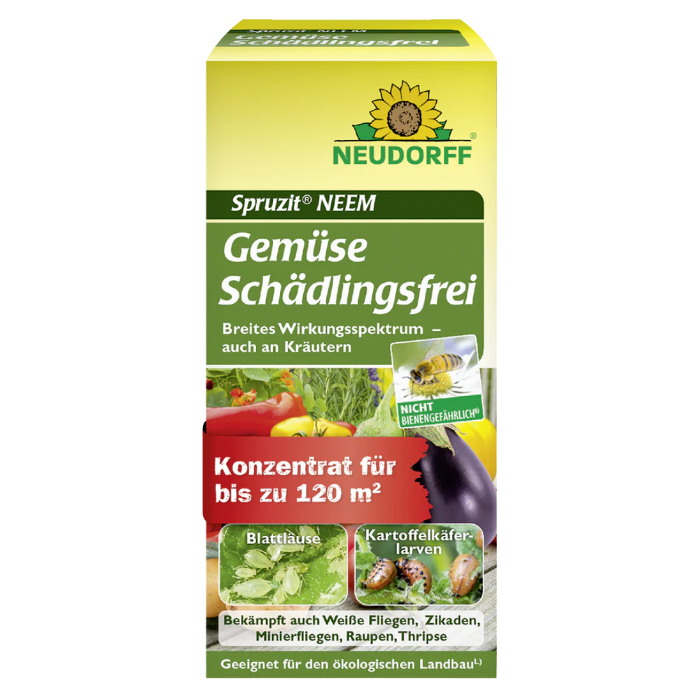 Spruzit NEEM GemüseSchädlingsfrei bietet natürlichen Schutz vor saugenden und beißenden Schädlingen an Gemüse und Kräutern. Der Neem-Wirkstoff Azadirachtin wirkt zuverlässig gegen Blattläuse, Käfer, Trauermücken und viele weitere Schädlinge. Geeignet für ökologischen Anbau, nicht bienengefährlich und sowohl für Gieß- als auch Spritzanwendungen einsetzbar. Ideal für Tomaten, Paprika, Gurken, Zucchini, Kräuter und Zierpflanzen