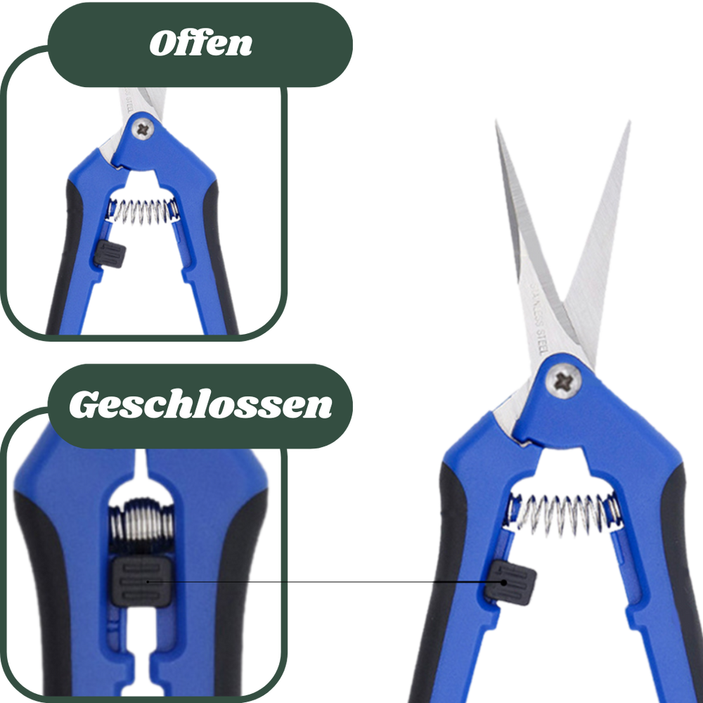 Diese hochwertige Ernteschere in Silber-Schwarz ist das ideale Werkzeug für jeden Grower. Die 17 cm lange Schere mit rostfreien Edelstahlklingen ermöglicht präzises Schneiden bei der Ernte, beim Entlauben sowie beim Trimmen von Blüten. Dank ergonomischer Griffe und federbelasteter Bauweise liegt sie optimal in der Hand und beugt Ermüdung vor — perfekt für längere Erntesessions. Mit praktischem Sicherheitsverschluss für sicheres Arbeiten. Ideal für die Pflege und Ernte von Cannabispflanzen und anderen feinen Kulturen.